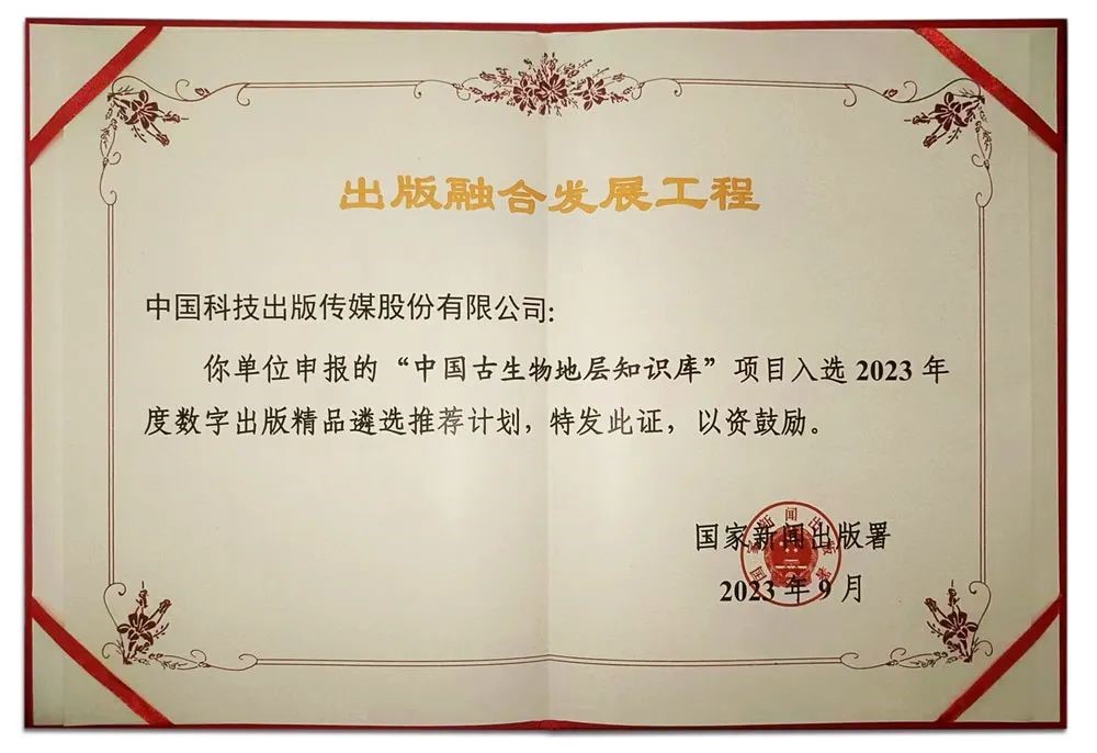2023年9月18日,國家新聞出版署發(fā)布《國家新聞出版署關(guān)于公布2023年度出版融合發(fā)展工程入選名單的通知》,“中國古生物地層知識(shí)庫”入選2023年度數(shù)字出版精品遴選推薦計(jì)劃。